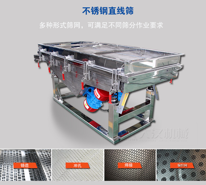 不銹鋼直線篩根據用戶現場要求可座式或吊式安裝,篩面有金屬編織網、鑄造、焊接、沖孔等多種形式,可滿足不同篩分作業要求。