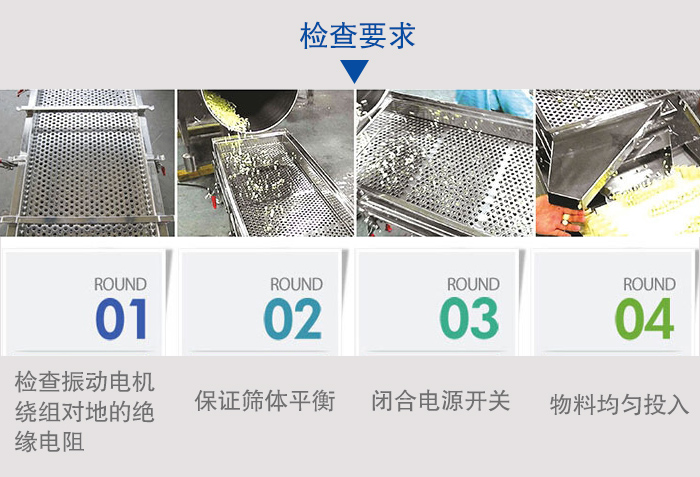 3、閉合電源開關,確認振動電機同步反向旋轉,進行10-20分鐘空運轉,設備在運行時如有異常聲音,應迅速關機進行檢查處理。設備運轉正常后,可將少量需篩分的物料通過進料口設入篩機內,確認物料向出料口方向行進,然后逐漸增加到所需和所能承受的給料量。