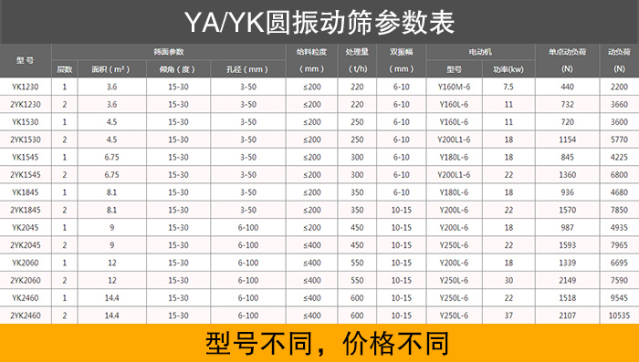 YA/YK系列圓振動篩的型號是非常多的,每種型號價格都不一樣,具體如上表所示。