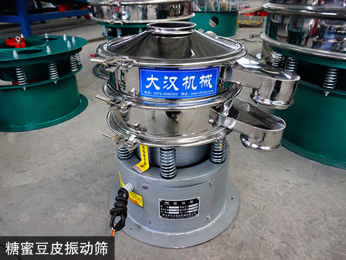 糖蜜豆皮振動篩的上下兩端安裝有偏心重錘,將電機的旋轉運動轉變為水平、垂直、傾斜的三次元運動,再把這個運動傳遞給多種規格的篩面。調節上、下兩端的相位角,可以改變糖蜜豆皮在篩面上的運動軌跡。