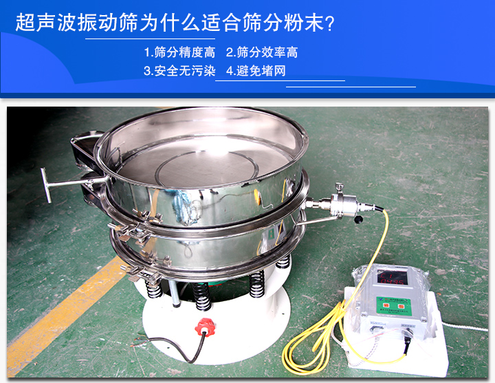 超聲波振動篩是在傳統振動篩的基礎山增加了一個低振幅,高頻率的振動波。它可以將220V,58Hz電能變為38KHz的高頻電能,輸入超聲波換能器,將其變成38KHz機械振動,從而達到高效十篩分和清網的目的,使超微細粉的篩分成為易事。