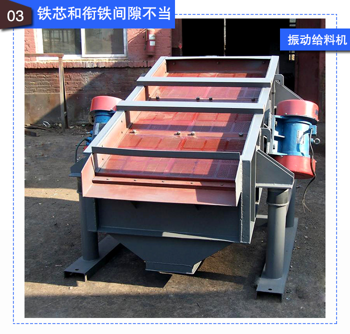 給料機鐵芯和銜鐵之間的間隙過大或者過小造成的,若出現這種情況,都會因機器達不到正常的振幅而影響給料機的給料。