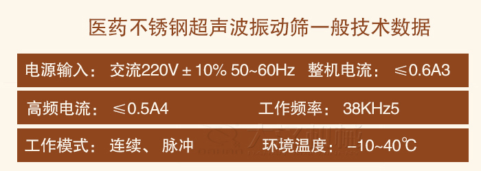 醫藥不銹鋼超聲波振動篩一般技術數據:醫藥不銹鋼超聲波振動篩超聲波諧振電源:1、電源輸入: 交流220V±10% 50~60Hz2、整機電流: ≤0.6A3、高頻電流: ≤0.5A4、工作頻率: 38KHz5、工作模式: 連續、 脈沖6、環境溫度: -10~40℃