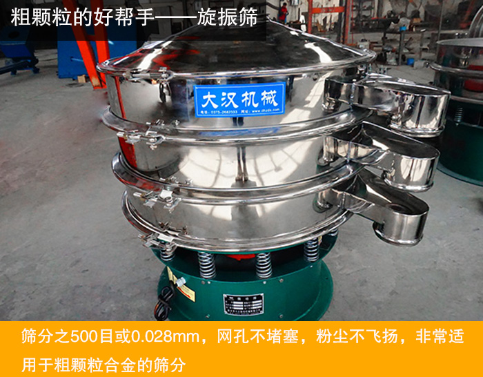 旋振篩采用直立式振動電機做為激振源,電機上、下兩端安裝偏心重錘,將電機的旋轉(zhuǎn)運動轉(zhuǎn)變?yōu)樗健⒋怪薄A斜的三次元運動,再把這個歌運動傳遞給篩面。調(diào)節(jié)上下兩端的相位角,可以改變物料的運動軌跡。旋振篩篩分效率高,設計精巧耐用,的粉類、粘液均可篩分。并且換網(wǎng)容易,操作簡單,清洗方便。可篩分之500目或0.028mm,網(wǎng)孔不堵塞,粉塵不飛揚,非常適用于粗顆粒合金的篩分。
