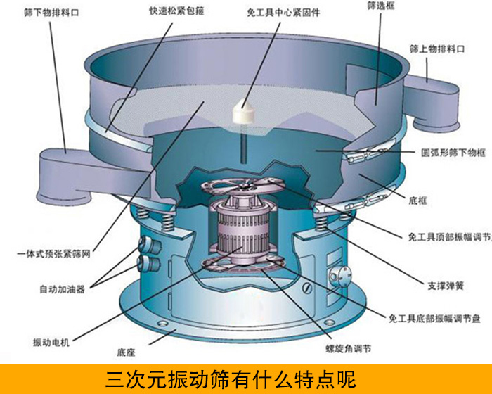 三次元振動篩設計精巧,可以篩分粉類、粘液類物料。并且操作簡單,清洗方便,不容易堵網;并且其獨特的網架設計,保證了它篩網使用壽命長,更換網時也只需3-5分鐘。作為一種輕型的精細篩分設備,廣泛的應用于化工、食品、金屬冶煉、建材等行業。